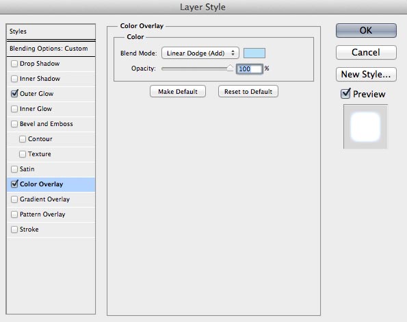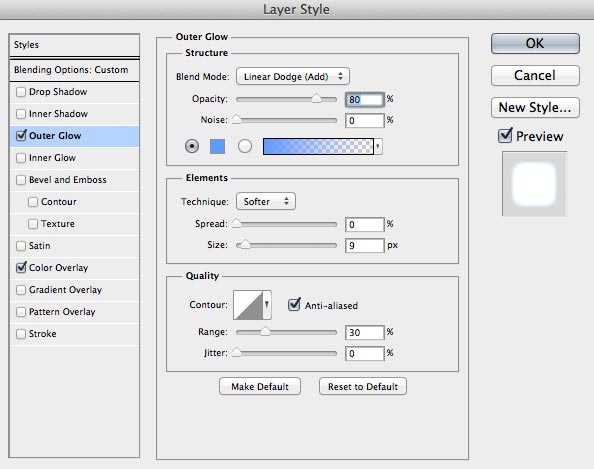 With the visible layer active, let’s apply some Layer Styles! This will be for the ‘light’ dots. The settings are below.