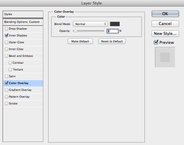 Now that the ‘light’ dots are completed, let’s unhide the second dots layer, and apply the following Layer Styles to it