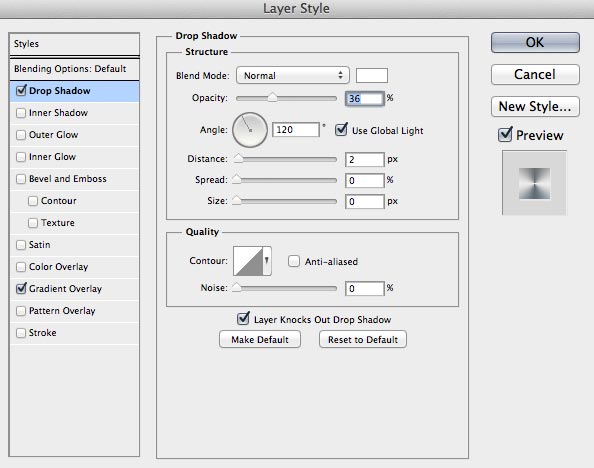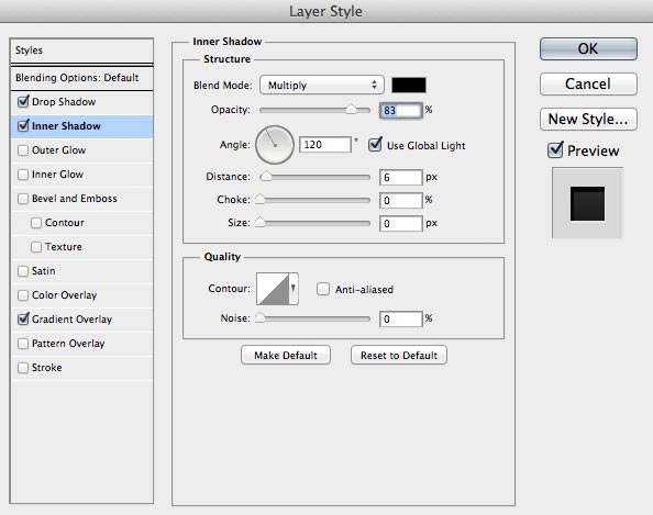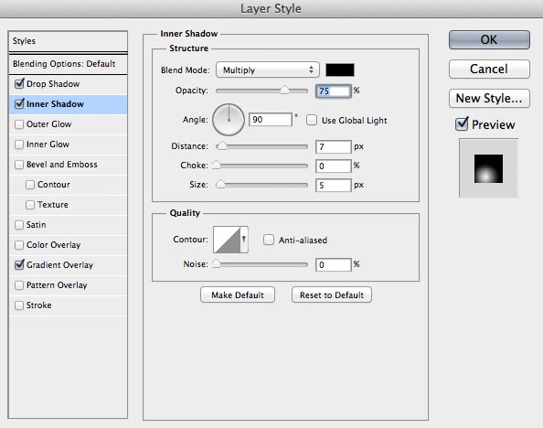 Good! Now that the shape of the stand is complete, let’s add some Layer Styles. We’re going to add a Drop Shadow, Inner Shadow, and a Gradient Overlay. The settings for all three are below.